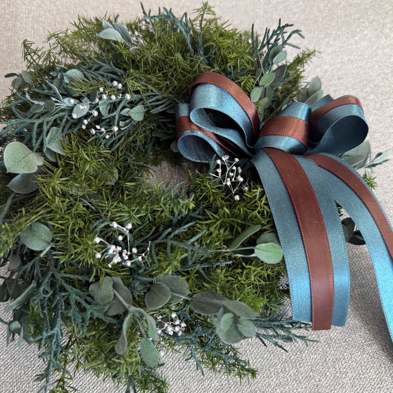 プリザーブドフラワーのみで作った【クリスマスリース】Blueは、季節の風情を感じさせる美しいクリスマスリースです。プリザーブドフラワーのグリーンを贅沢に使用し、ナチュラルな魅力を引き出しつつ、高級感のあるリボンで華やかさを演出しています。お部屋のインテリアはもちろん、玄関やリビングに飾ることで、クリスマス気分を感じることが出来ます。
