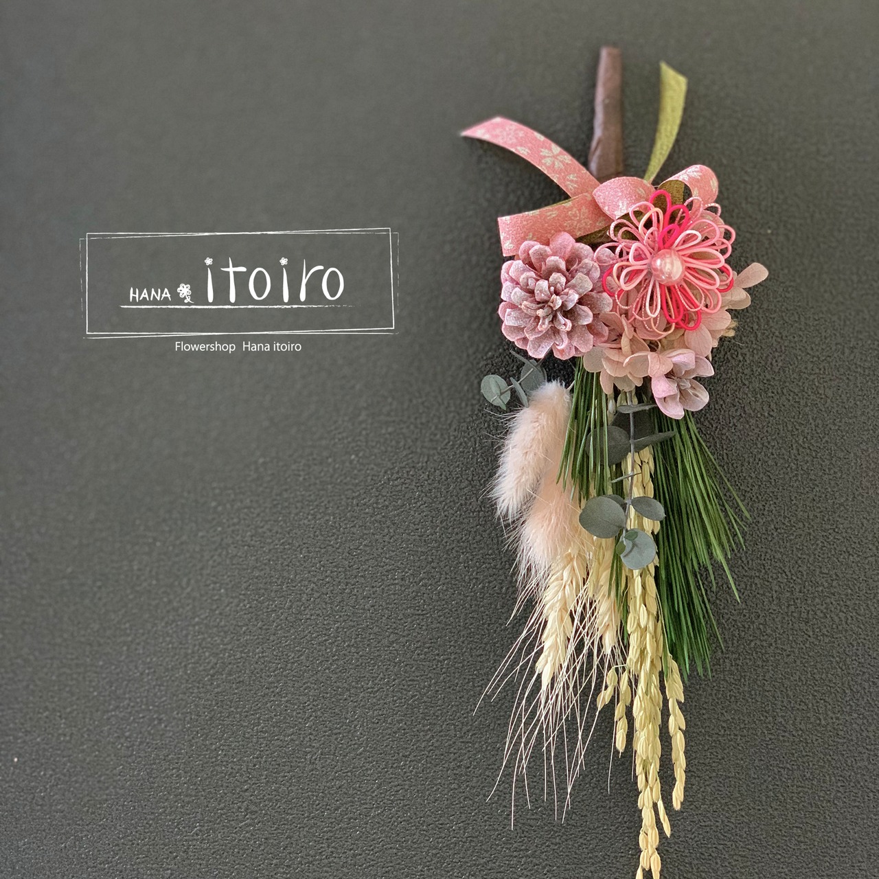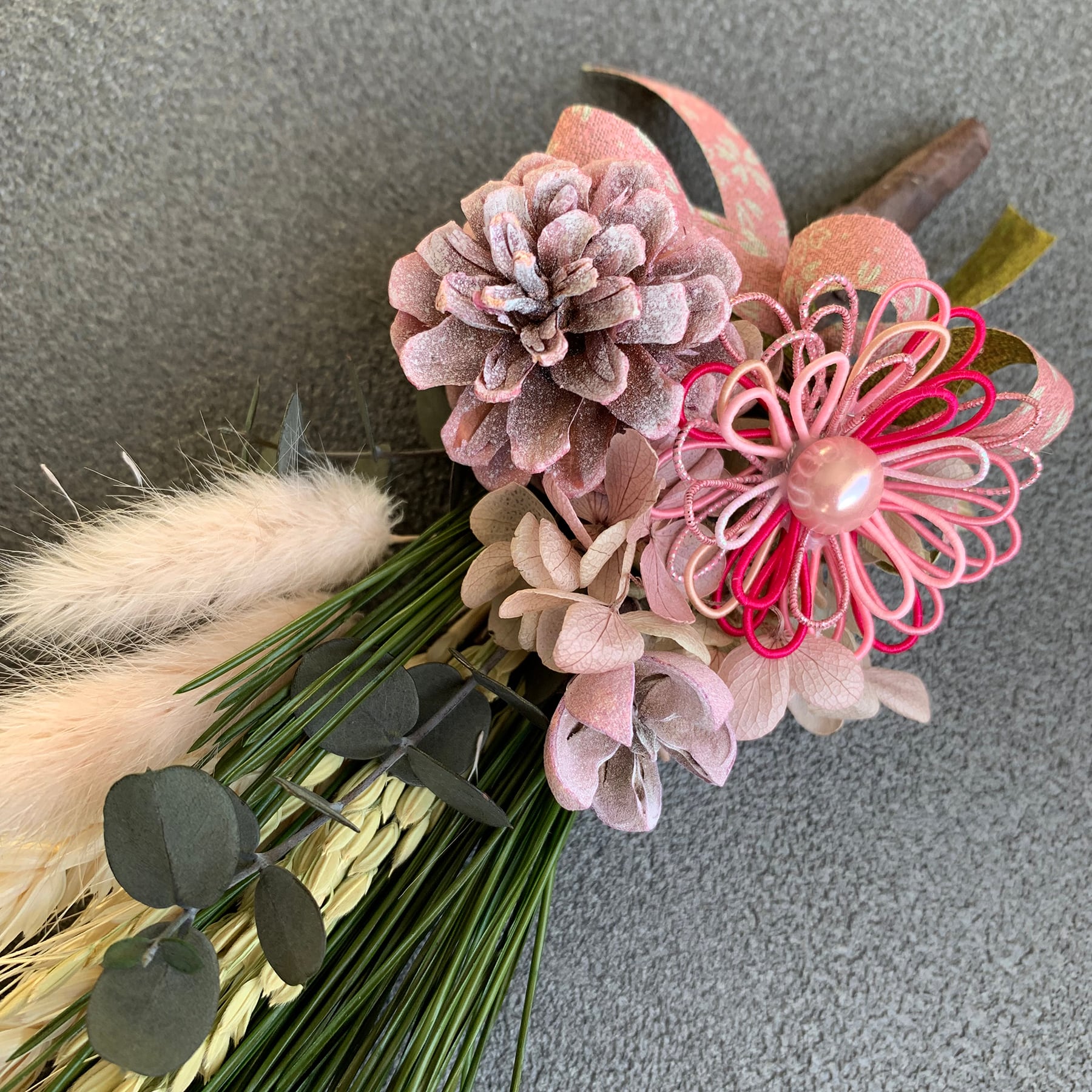 プリザーブドフラワーとドライフラワーを使用し水引アートフラワー(水引作家のKyoko Mitsumata さんにご指導いただき作成しております。)を取り入れた小さなお正月飾りです。