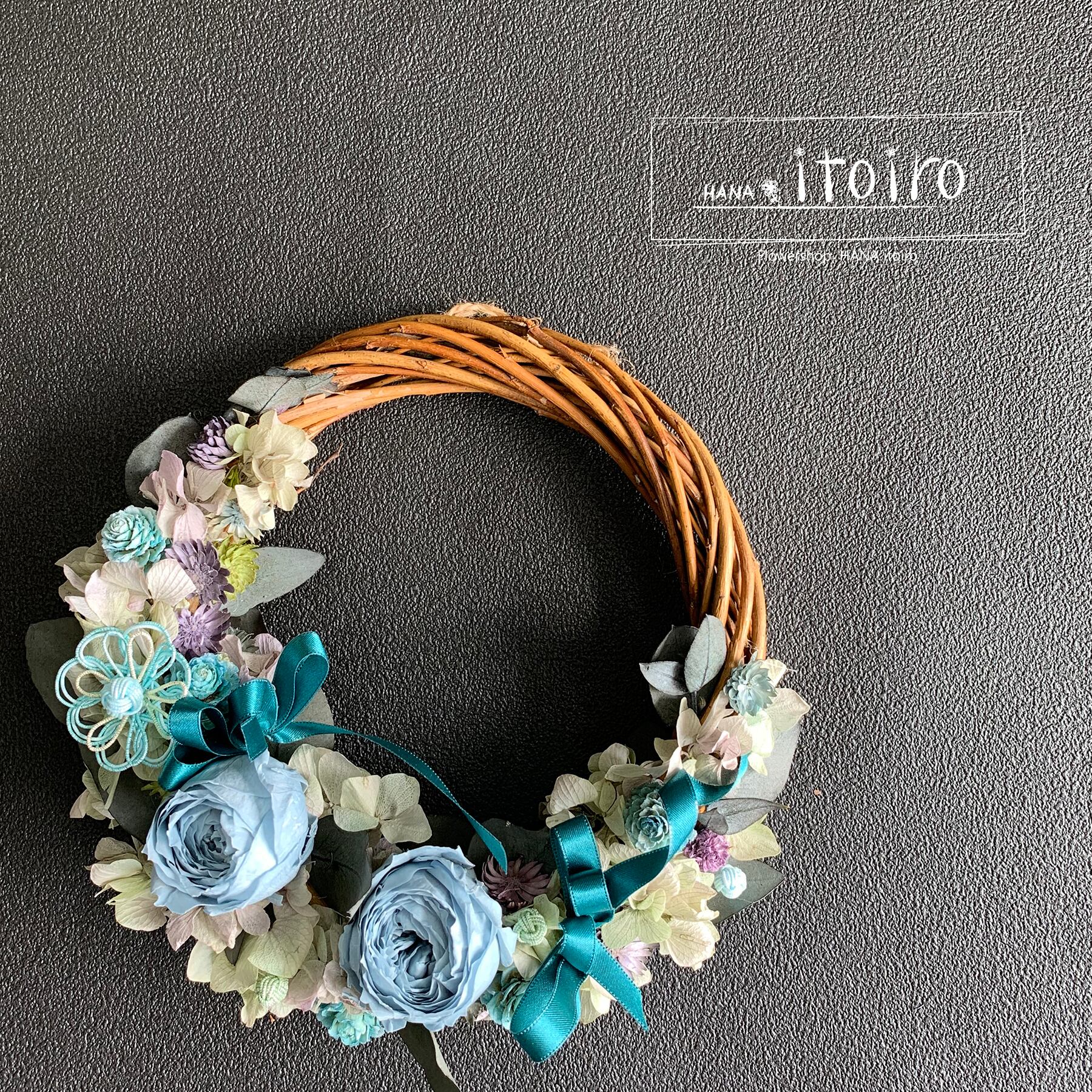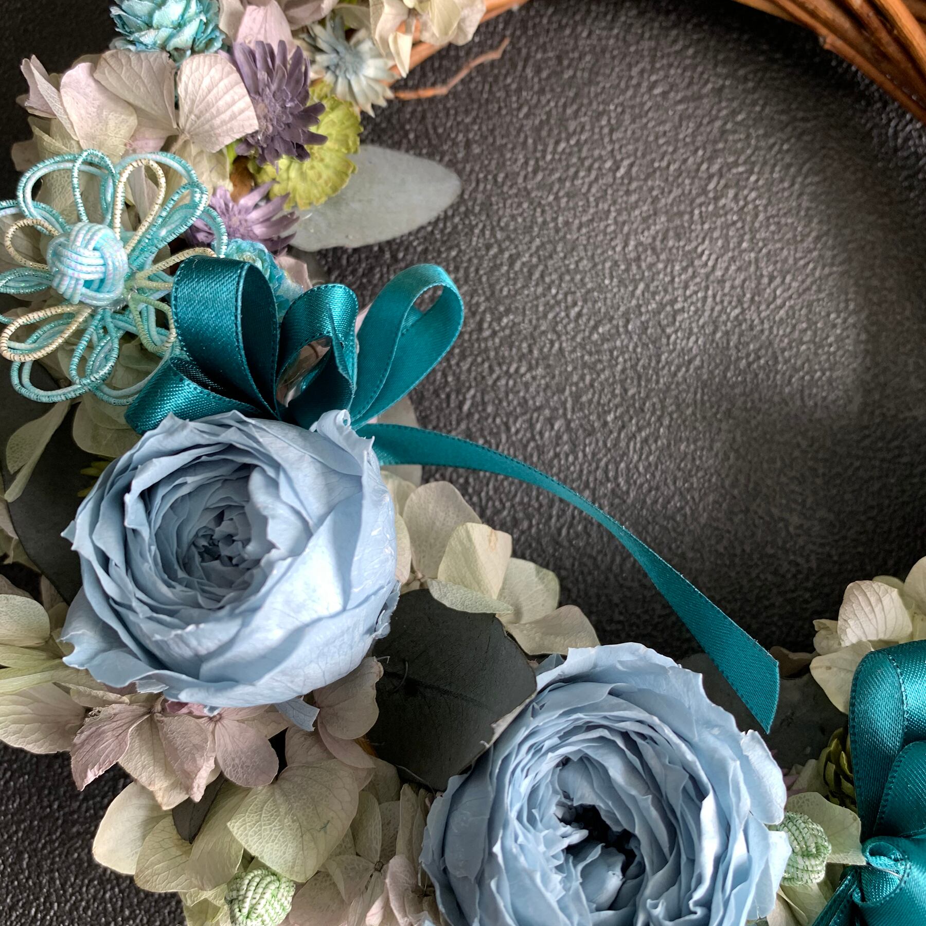 プリザーブドフラワーと水引フラワーで作ったクレッセントリースです。