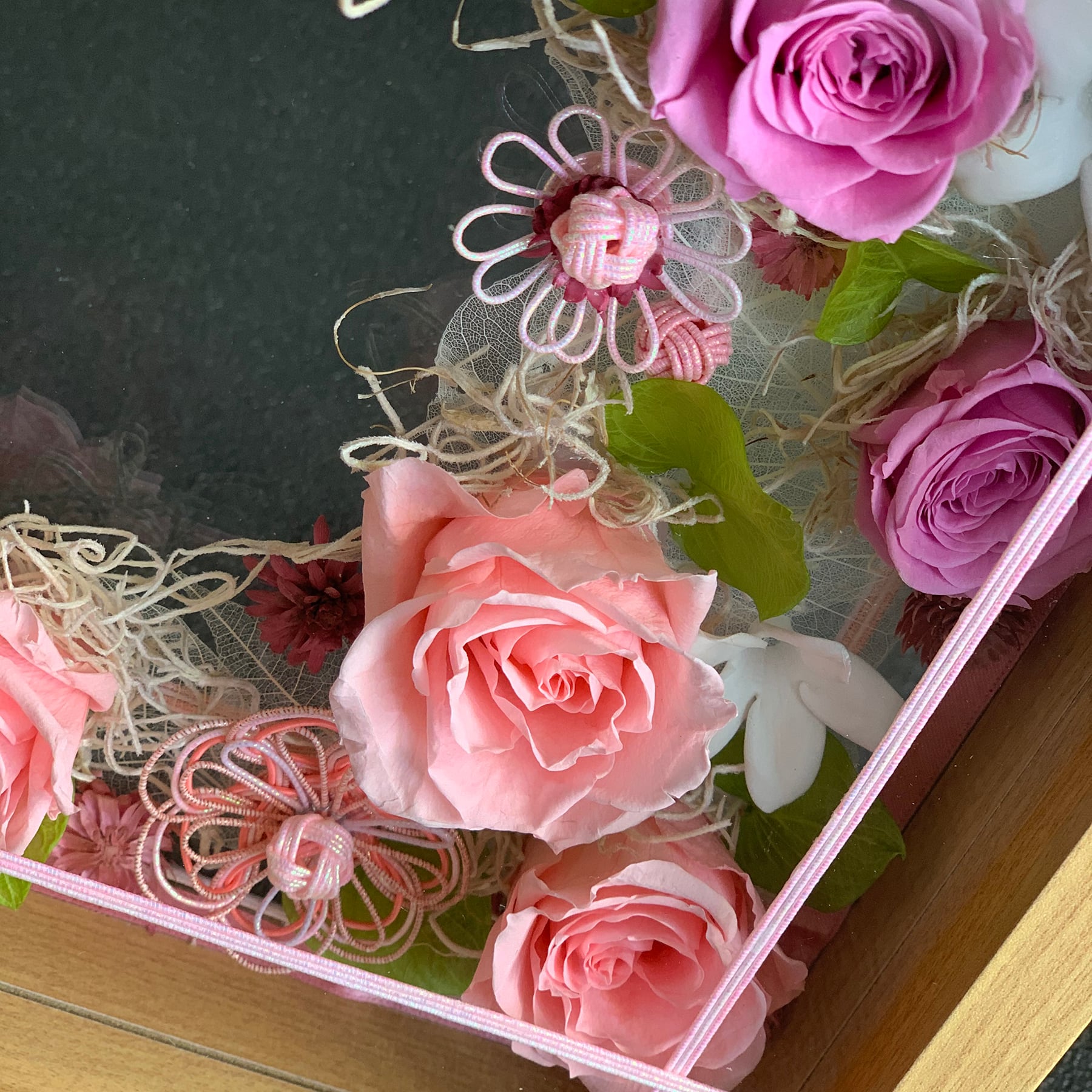 プリザーブドフラワーと水引フラワーで作ったコラージュフレームアレンジです。