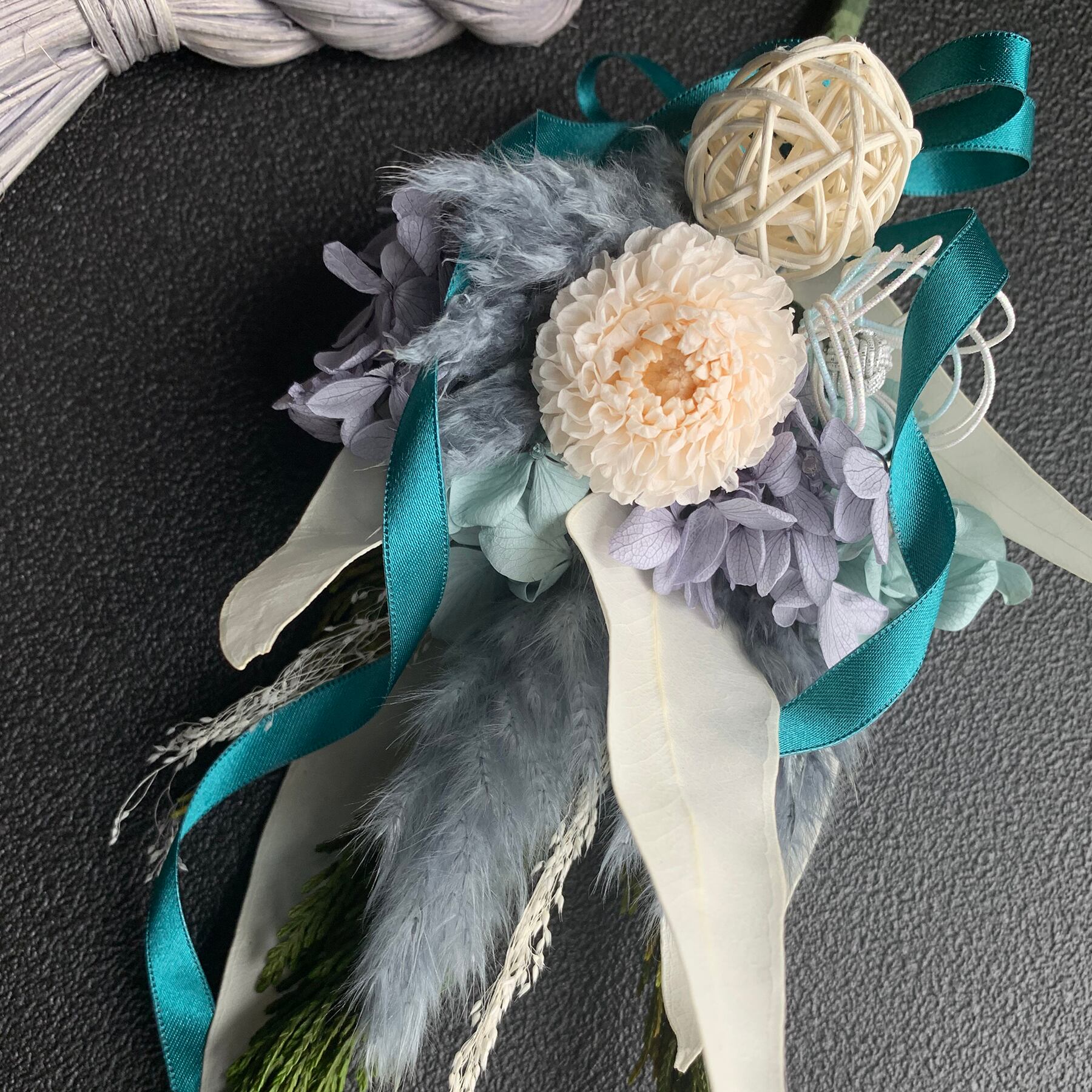 ラタン(トウ)製のタッセルにプリザーブドフラワーとドライフラワーで作ったスワッグを取り付けたお正月飾りです。
